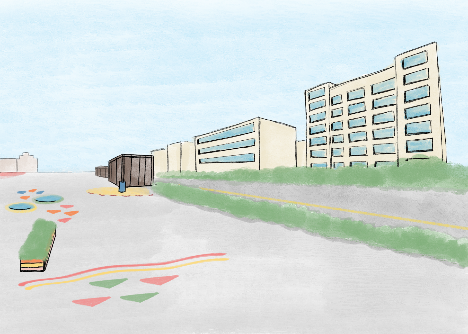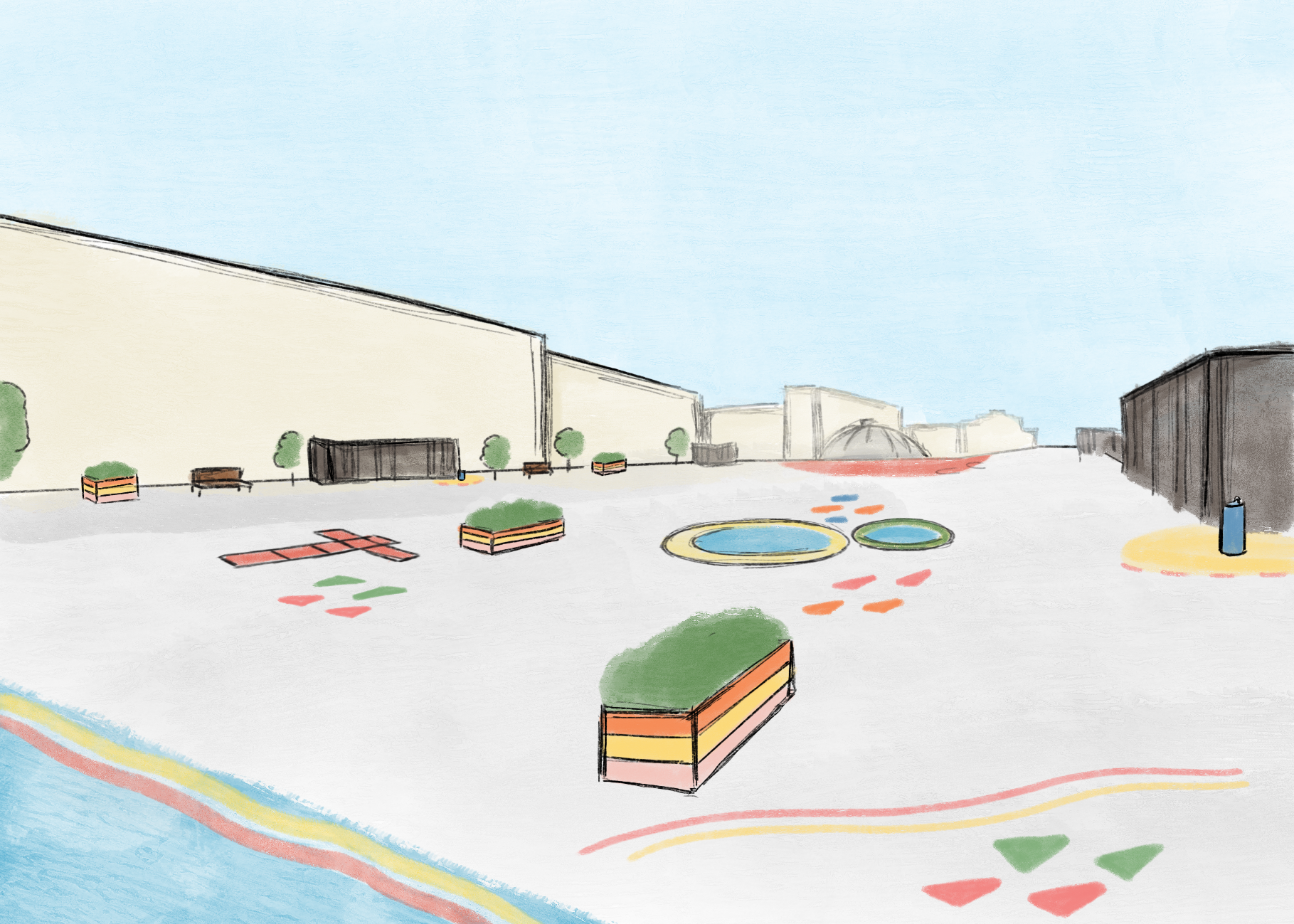 The place is made of different floors: the relax zone is covered with gravel, the sports area and the playground zone are made of tartan floor (soft material). And the rest of the concrete floor is decorated with playful floor paintings.
