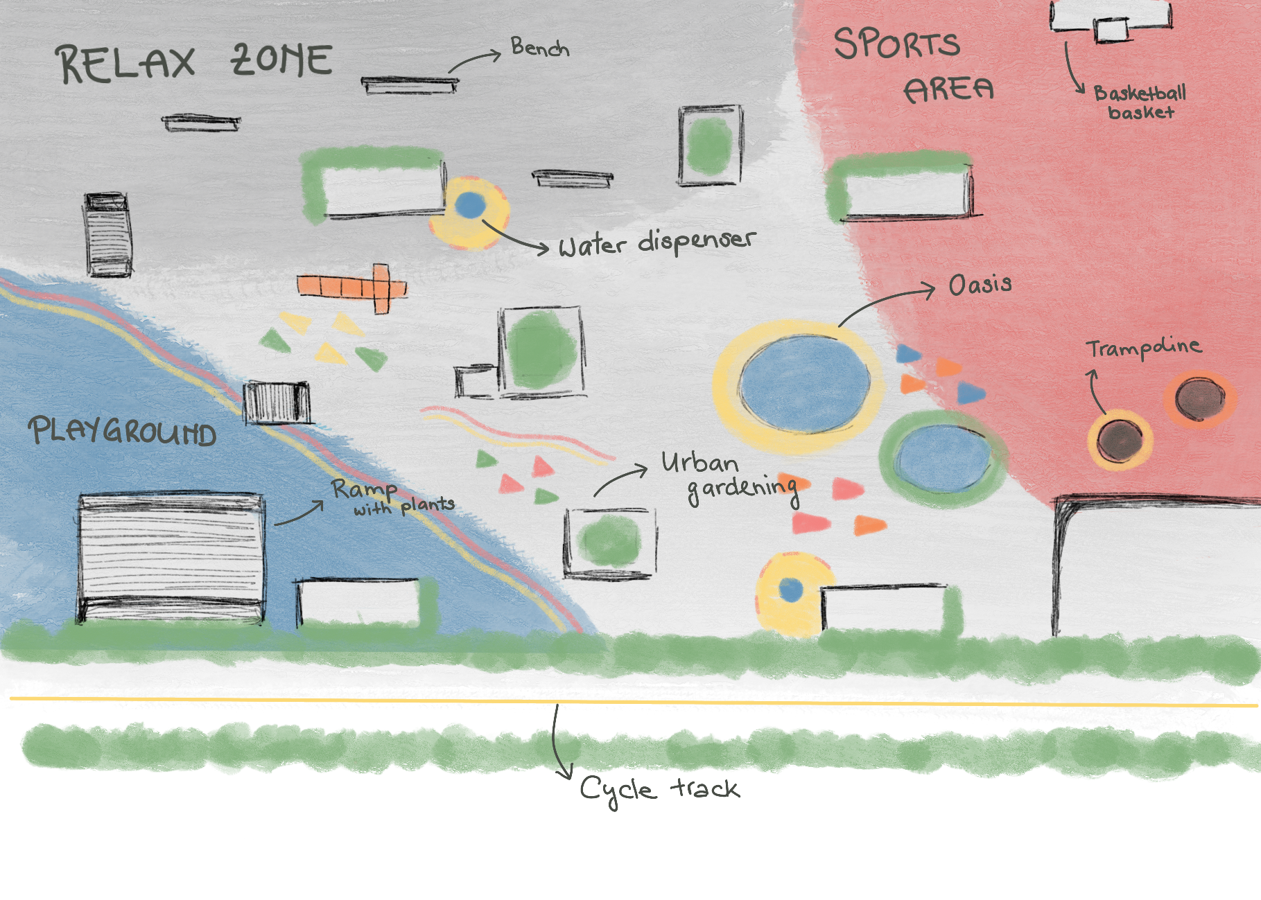 The place is made of different floors: the relax zone is covered with gravel, the sports area and the playground zone are made of tartan floor (soft material). And the rest of the concrete floor is decorated with playful floor paintings.